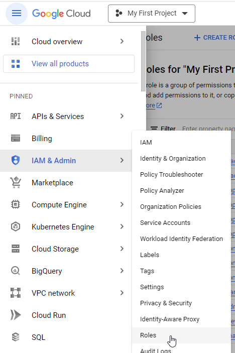 From the Google Cloud console, go to IAM & Admin > Roles.