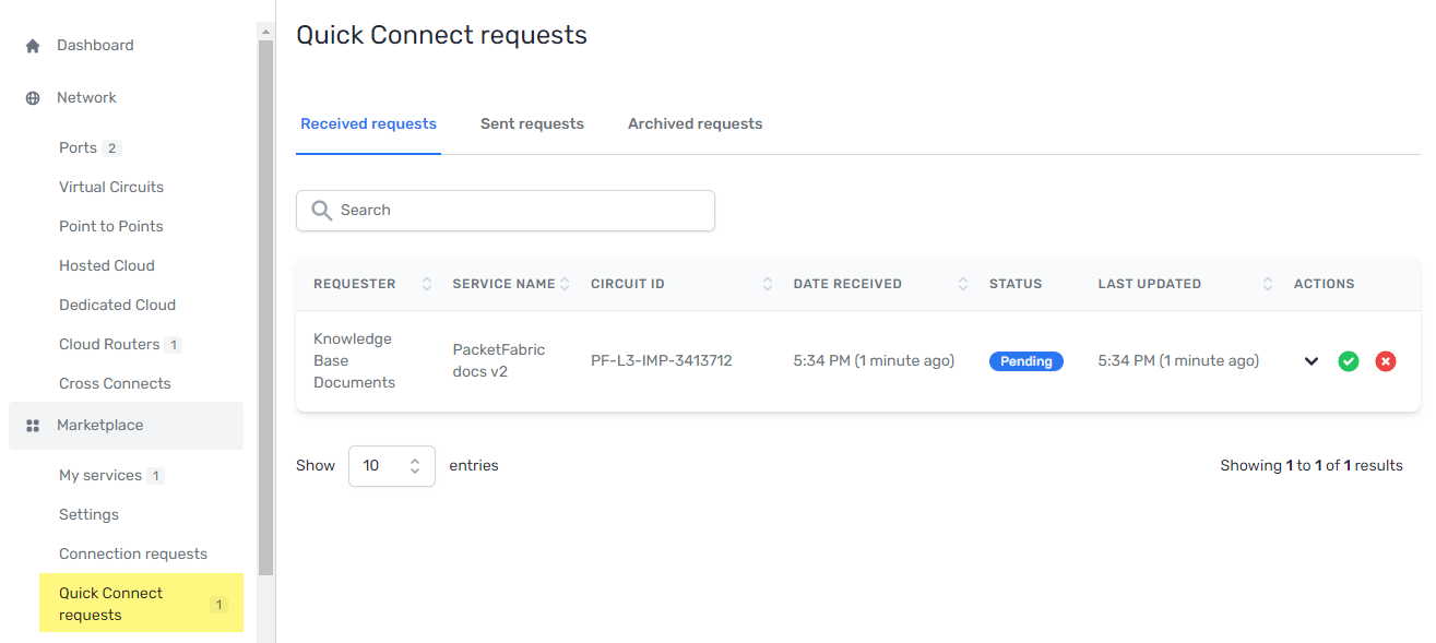 As a Quick Connect service provider, you can view and manage received requests under Marketplace > Quick Connect Requests.