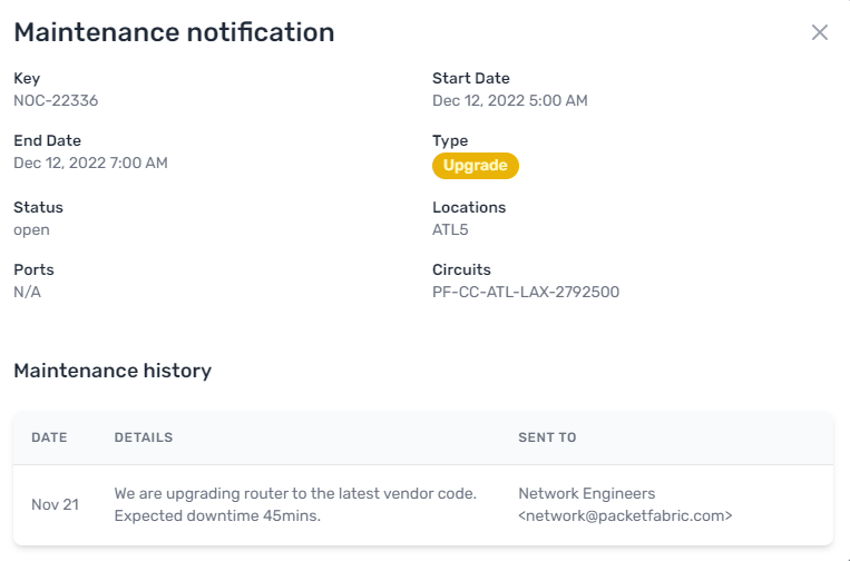 - If emergency maintenance is necessary, PacketFabric will attempt to provide as much notice as possible and will email all Technical contacts defined in the portal.